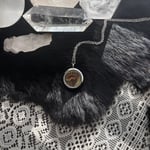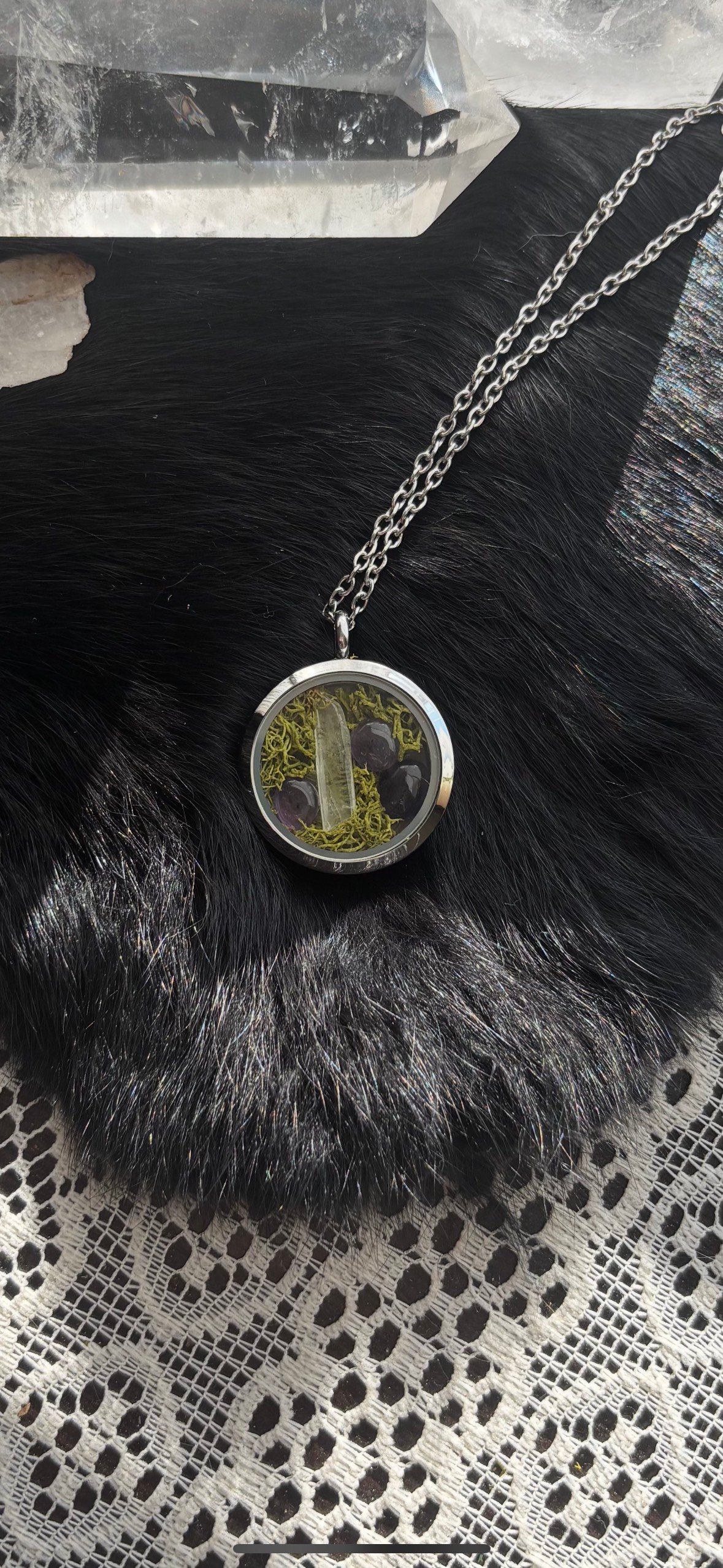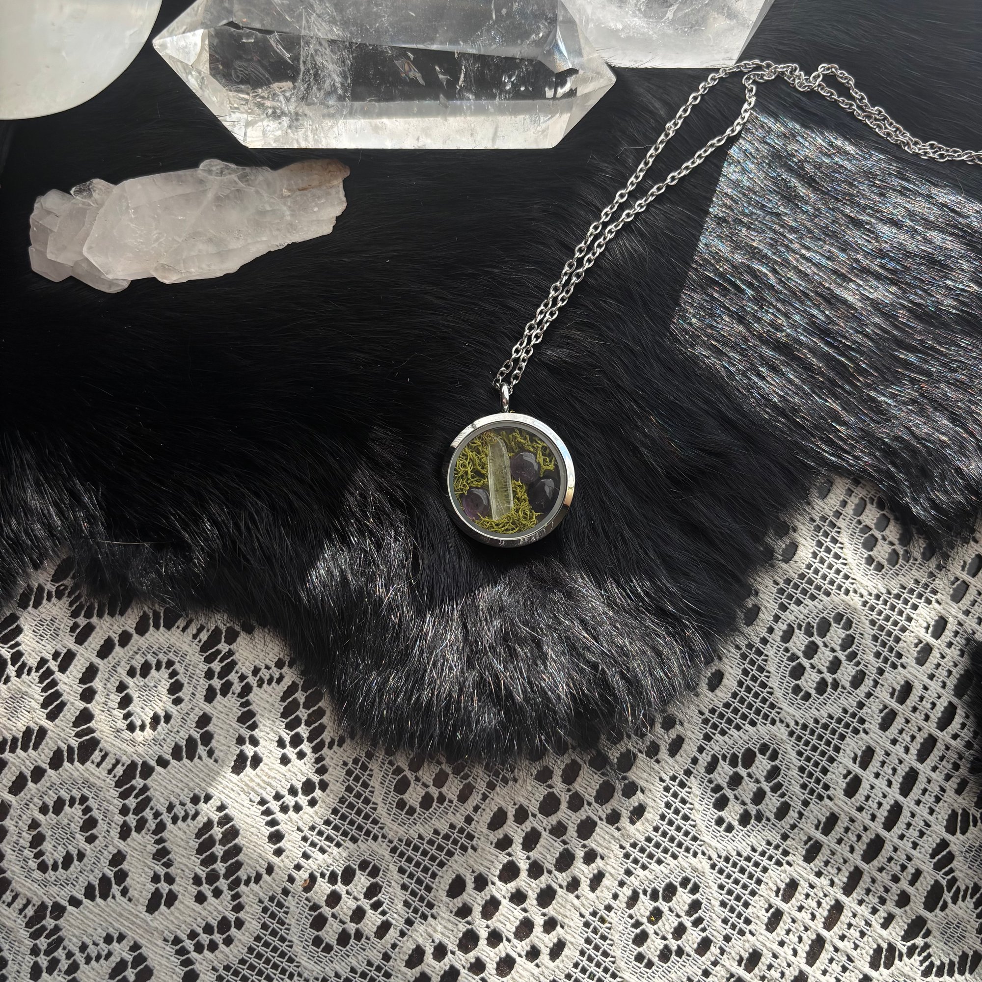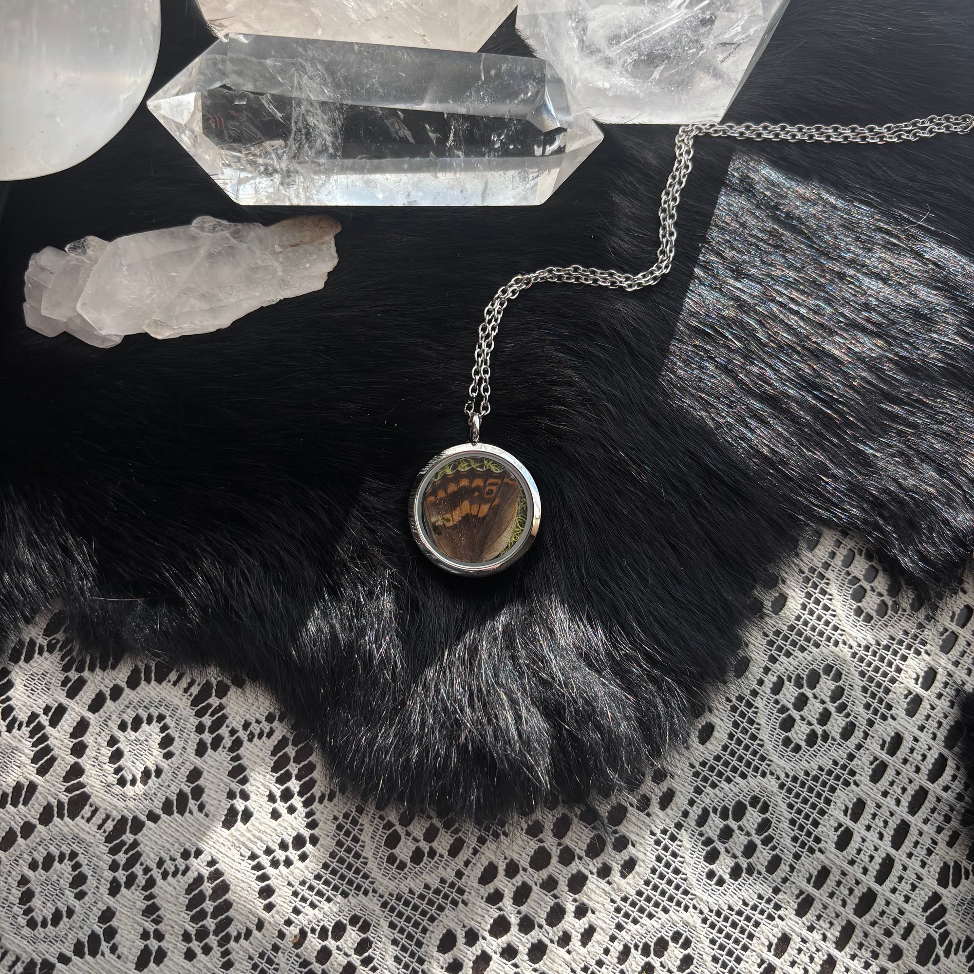 This glass locket holds a bed of moss, a quartz point and several amethyst chips on one side while on the other is a real butterfly wing. Comes on a delicate stainless chain.