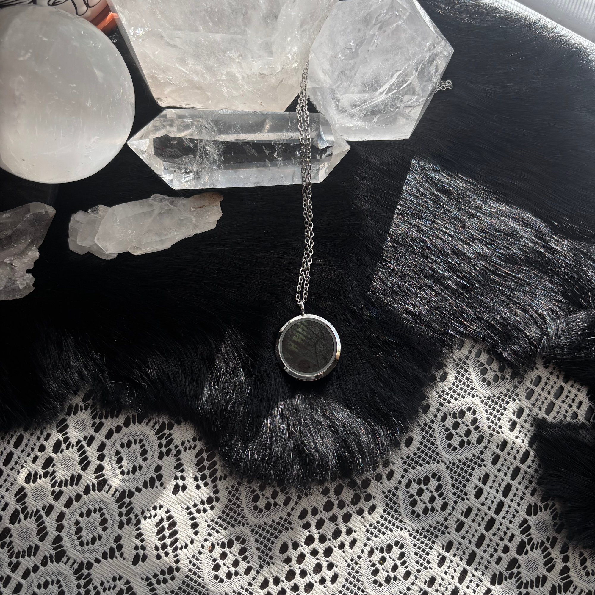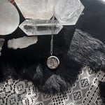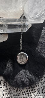 This glass locket holds a five quartz points on one side while on the other is a real butterfly wing. Comes on a delicate stainless chain.