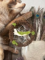 This woven wreath features an ethically sourced fox jaw that has moss and clear quartz points for teeth. Along the bottom dangle three aura quartz points as well.