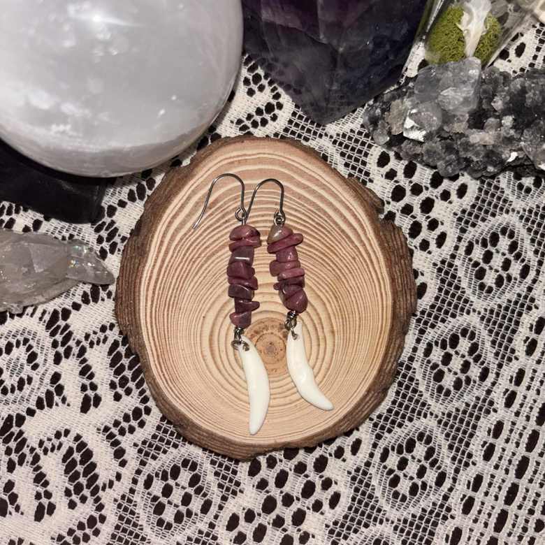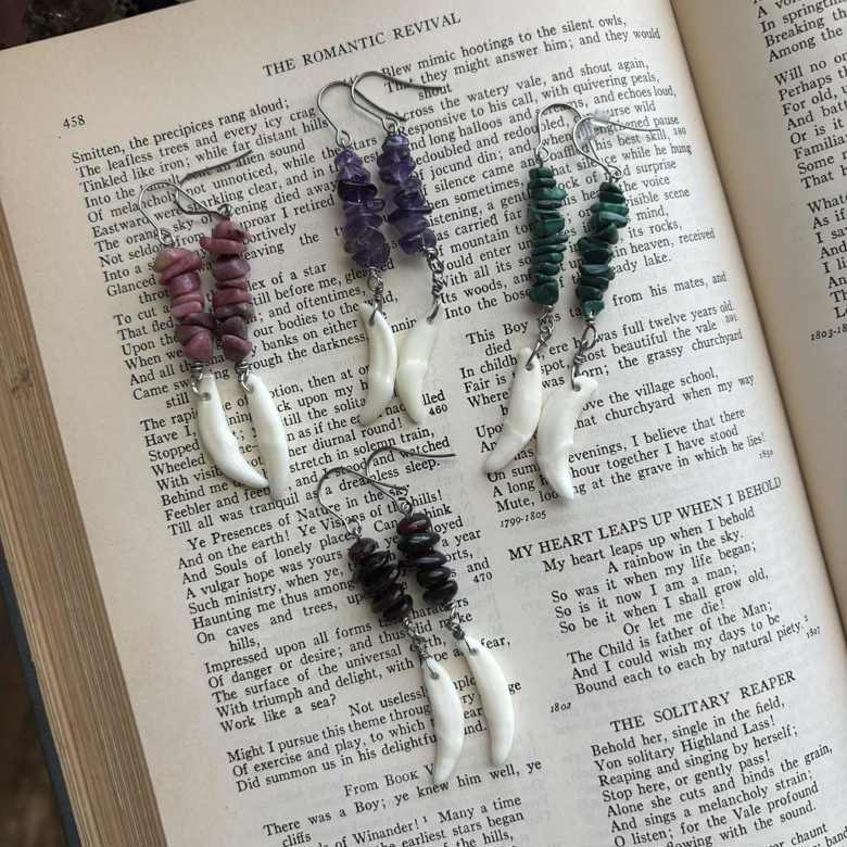 These dangly earrings feature real crystal gemstone chips and ethically sourced coyote canine teeth.