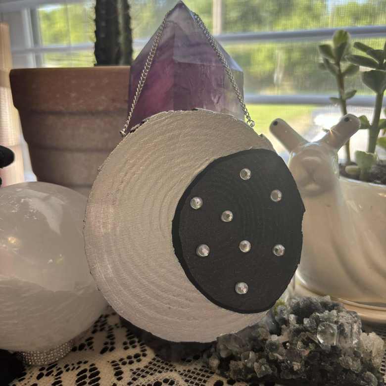 This little painting was done on a 3" wood slice with acrylic paints and has rhinestones to mimic the stars in the night sky. Comes with a silver chain attached to allow you to hang it on your wall.
