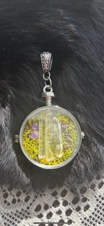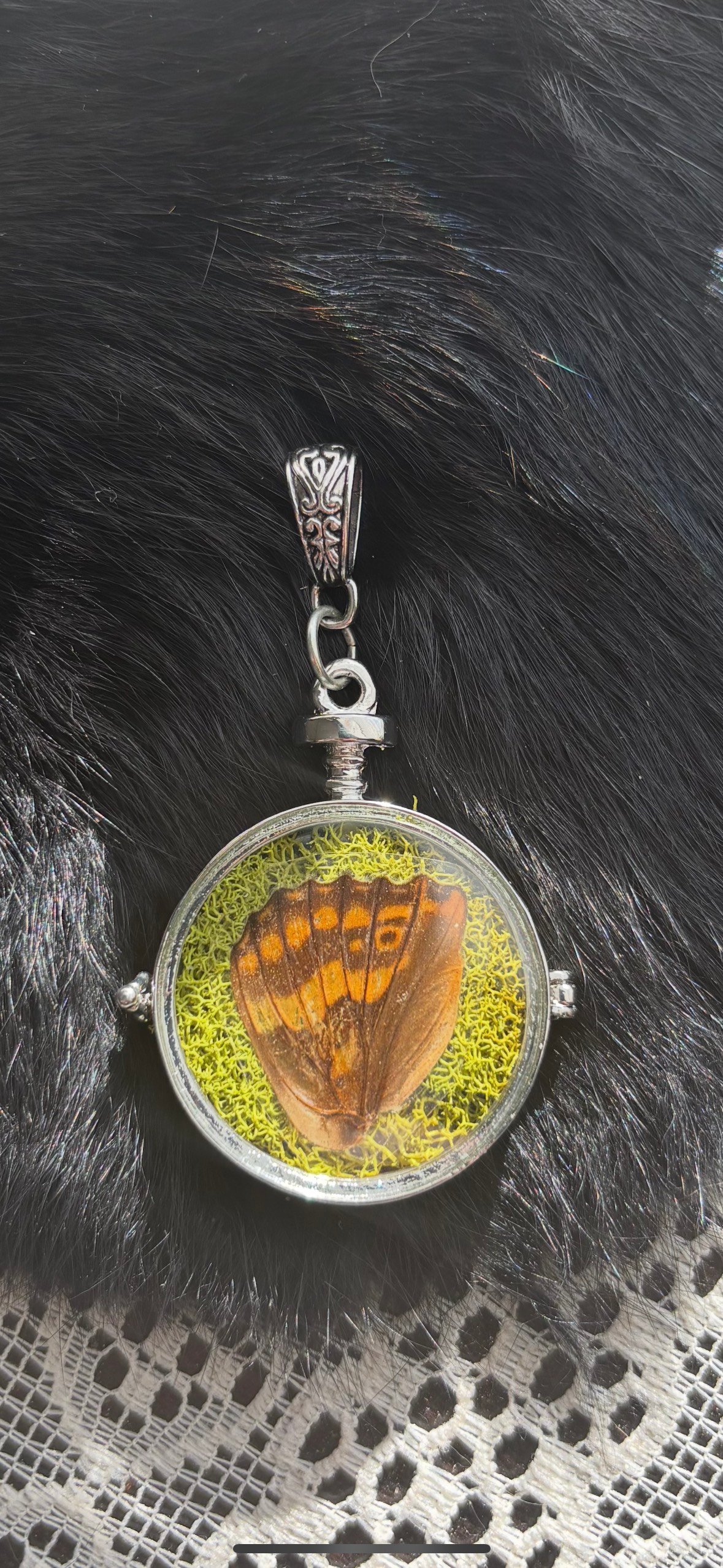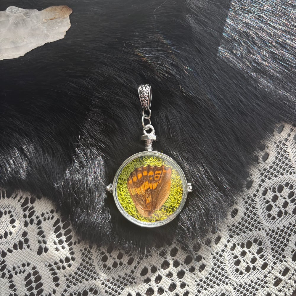 This large glass locket contains moss, clear quartz points, amethyst pieces on one side and a real butterfly wing on the other side.