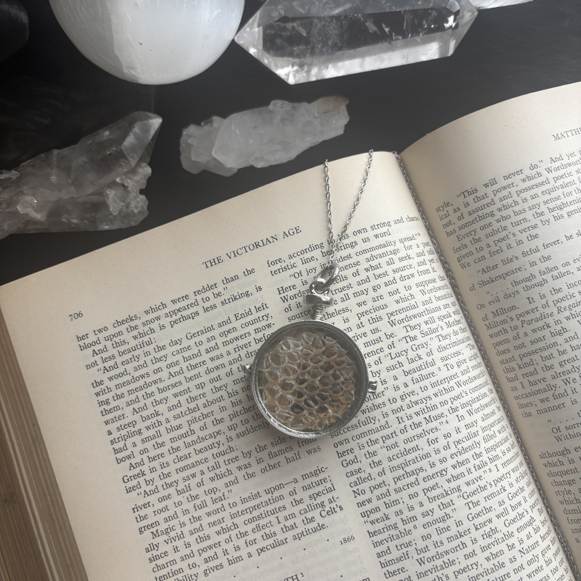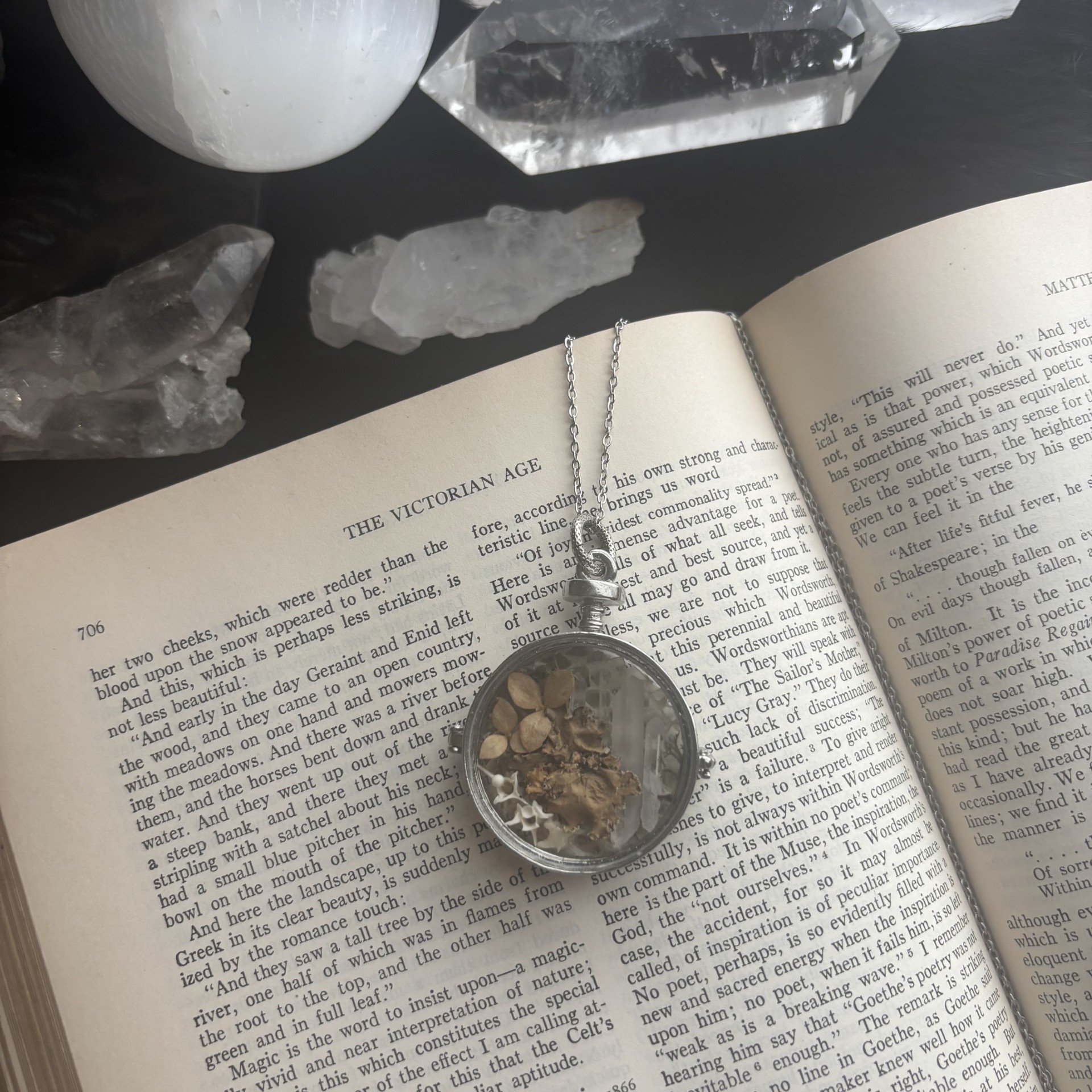 This large glass locket features dried hydrangea and lichen, clear quartz points, ethically sourced rattlesnake vertebrae and snake skin shed. Will come on a delicate stainless steel chain.