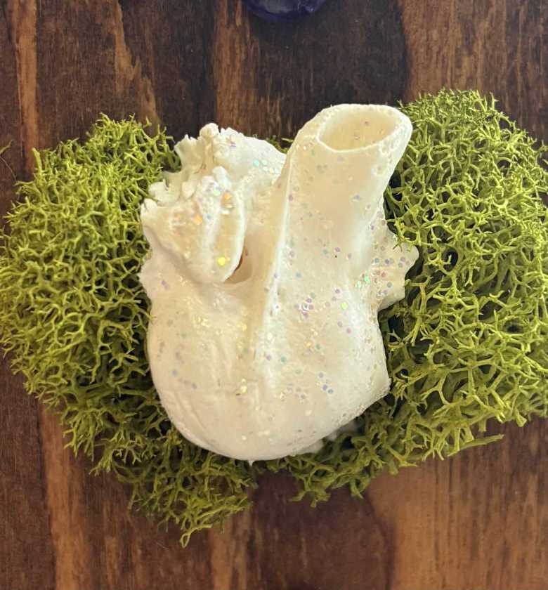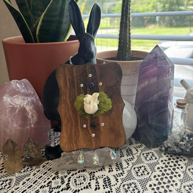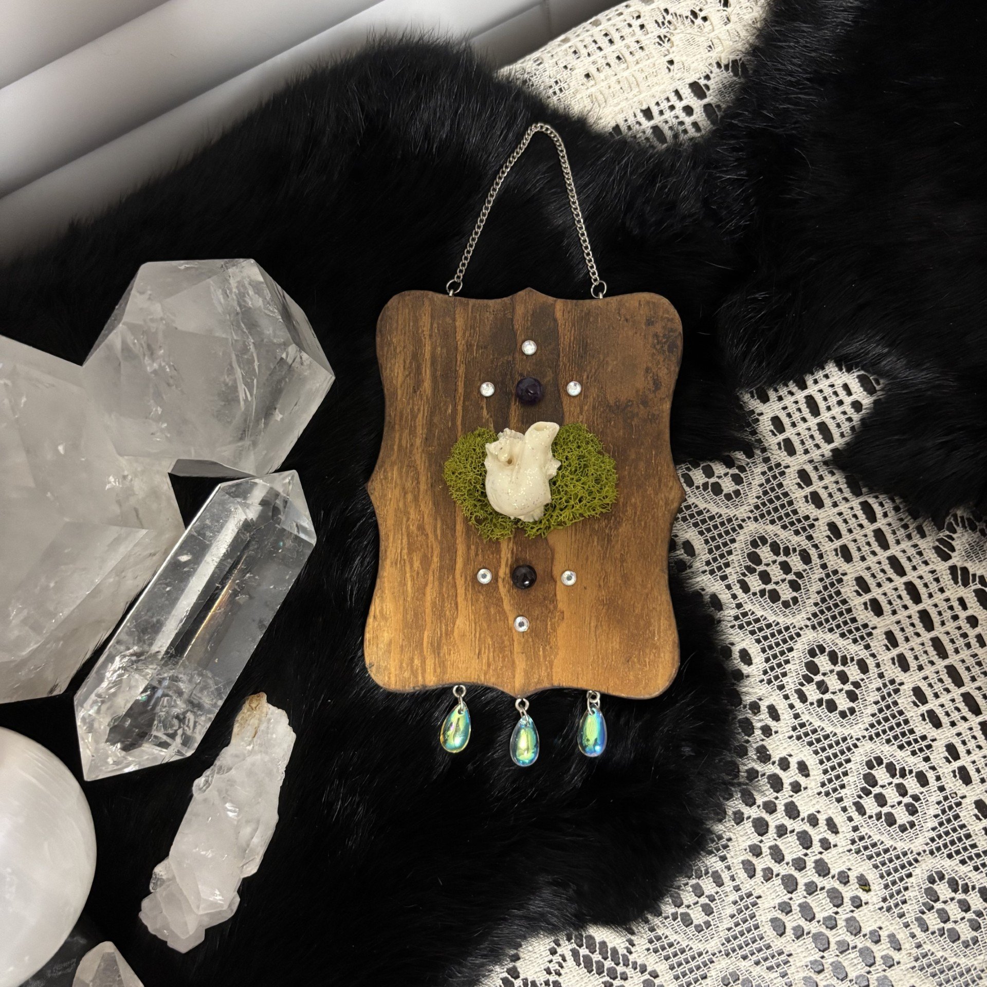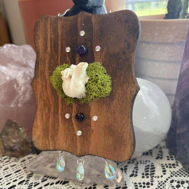 This little 4x3" wooden plaque features preserved reindeer moss, six AB rhinestones, three AB teardrop dangles, two pieces of juicy amethyst and the inner ear bone (auditory bullae) of a muskrat that resembles an anatomic heart and can hold the teeniest flower buds in the open valve. The bone was painted in a clear gloss that has iridescent flakes in it.