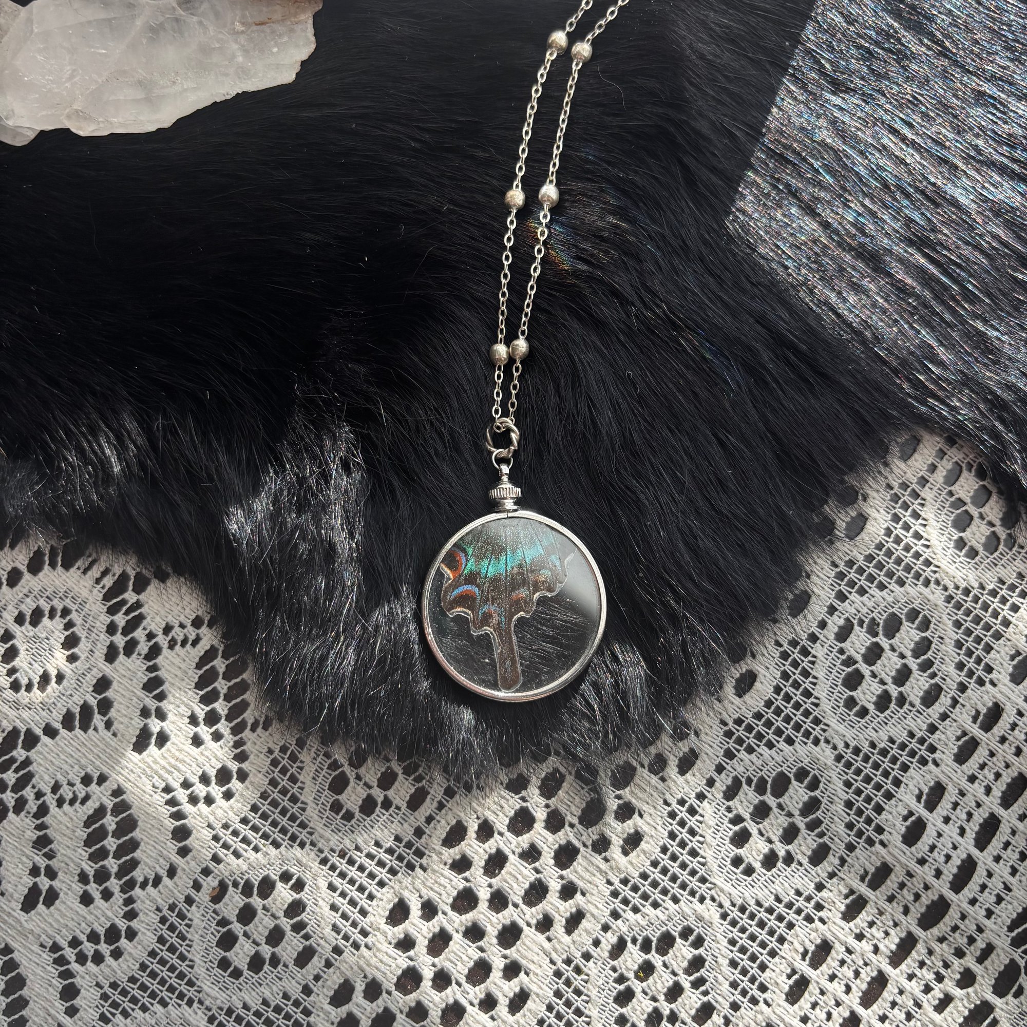This double sided glass pendant features a real butterfly wing and comes on a delicate satellite chain.